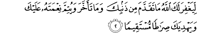 supaya Allah memberi ampunan kepadamu terhadap dosamu yang telah lalu dan yang akan datang serta menyempurnakan nikmat-Nya atasmu dan memimpin kamu kepada jalan yang lurus,